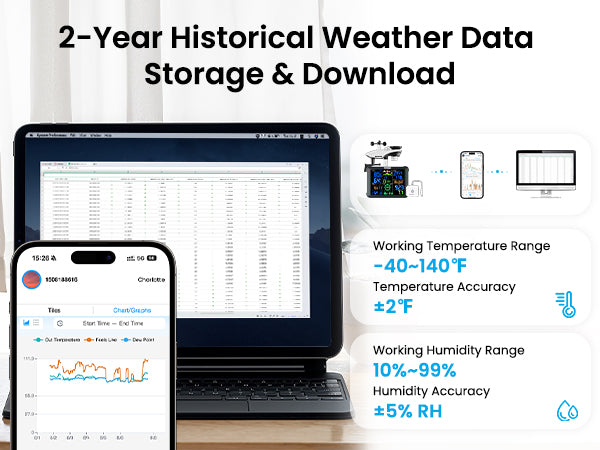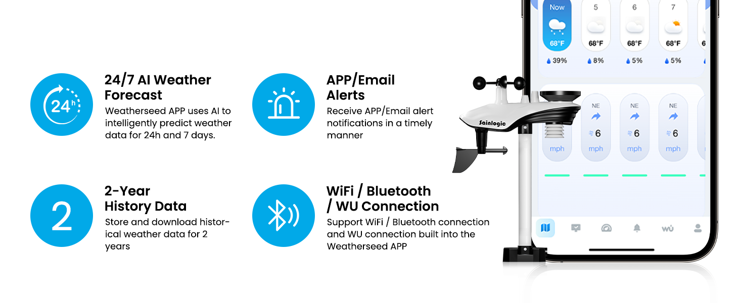 24/7 Weather Forecast by Weatherseed® AI,Wind Speed and Rain Gauge Outdoor,UV,Alerts & 2-Year Data Export