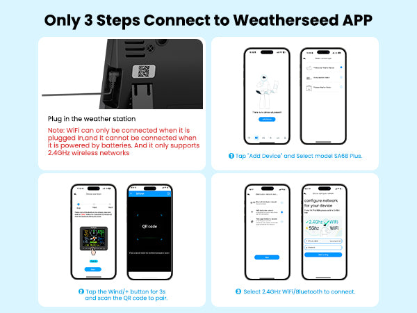 Connect to the Weatherseed APP via 2.4GHz WiFi, with the optional integration of Weather Underground (WU) service. The AI algorithm provides 24/7 weather monitoring and high-precision forecasting, and real-time pushes accurate alerts for sudden changes in temperature, humidity, and air pressure, providing decision support for home protection, gardening management, or outdoor adventures.(Only 2.4G WiFi) -