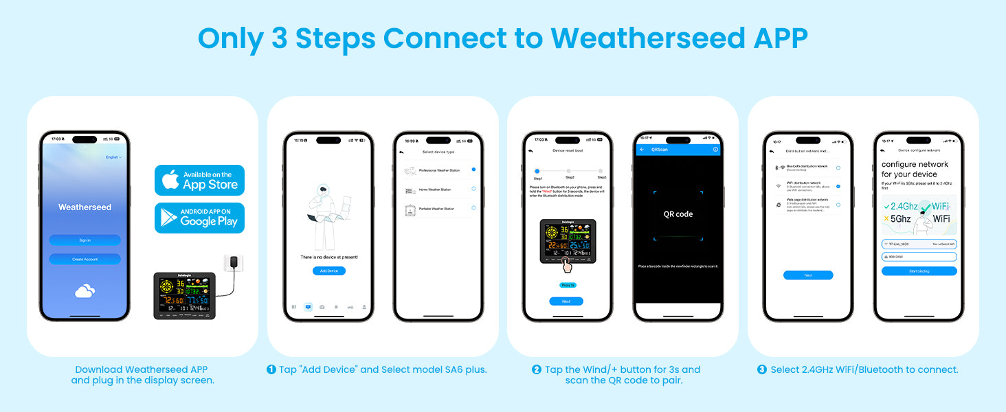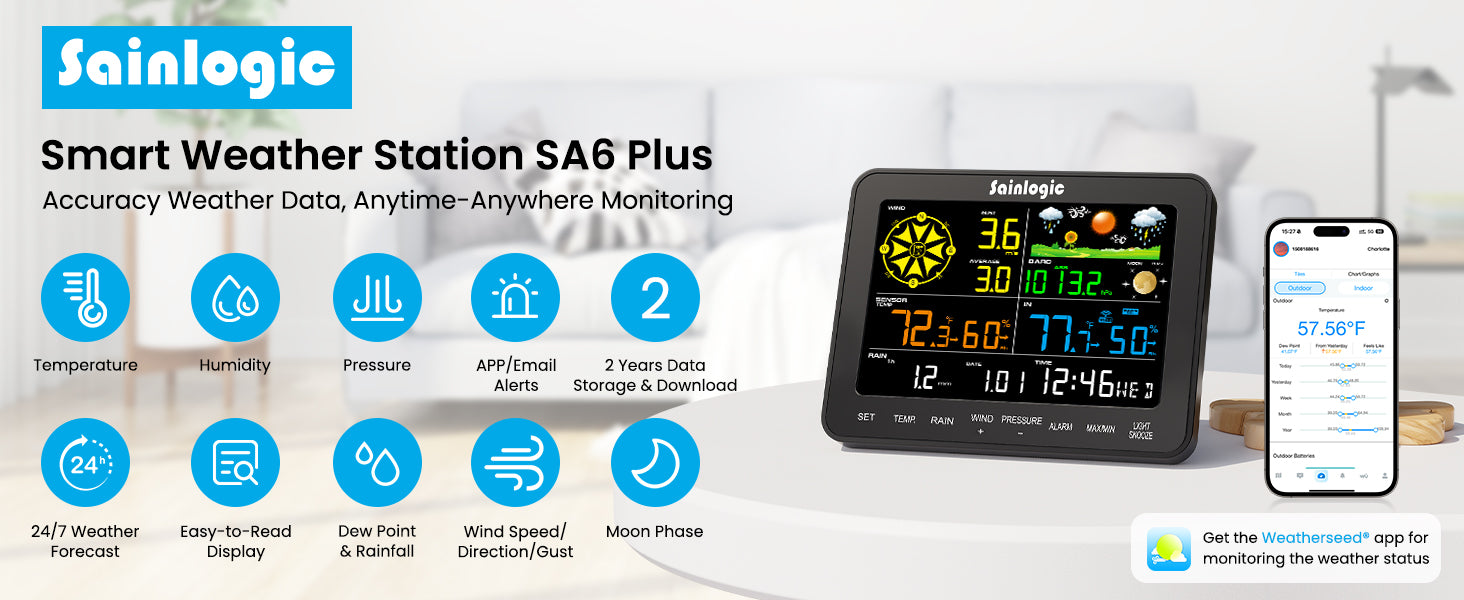 - WiFi + Weatherseed App + 24/7 Al Forecast & Alerts: Connect via WiFi to our Weatherseed app for AI-driven 24/7 weather monitoring and forecasts. Receive instant alerts for critical changes in temperature, humidity, and barometric pressure directly on your smartphone, empowering decisions for home, garden, or outdoor activities.