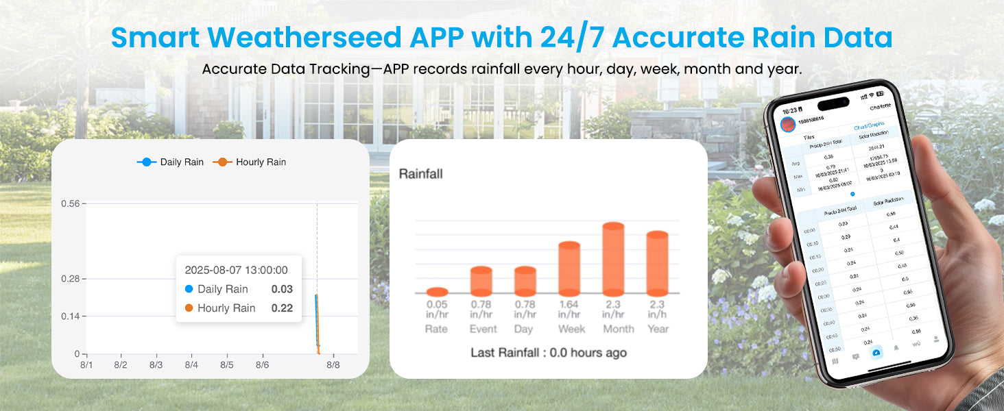 - Precision Rain Monitor: Professional-grade accuracy of ±1mm (for rainfall <15mm) and ±7% (15-9999mm). Weatherseed APP provides precise rainfall monitoring with accurate data recorded every hour, day, week, month and year, delivering reliable hydrometric data for critical weather monitoring. The 330ft (100m) wireless signal ensure full coverage for farms, orchards, pastures and residential areas.