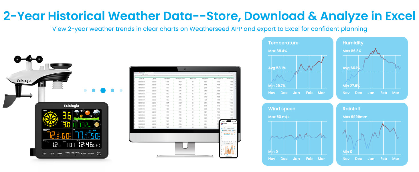 - 2-Year Data Storage & Download: Supports storing and downloading 2 years of comprehensive weather data with Excel export capability. Users can analyze long-term trends through intuitive charts, including temperature/humidity variations, severe weather frequency, and seasonal patterns - ideal for both weather enthusiasts and professional agricultural applications.