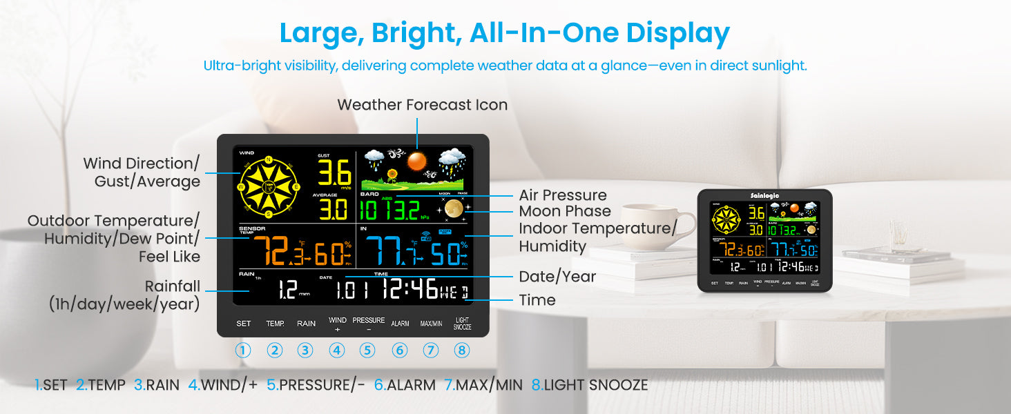 - Clear Display Easy Reading: This weather station is designed for effortless viewing, featuring a high-contrast display and user-friendly interface. Specially enlarged, bold fonts make key data—such as temperature and humidity—easy to read at a glance. Ideal for middle-aged and elderly users with declining vision, it allows them to track weather conditions without eyestrain. A thoughtful choice for gardeners and outdoor enthusiasts.