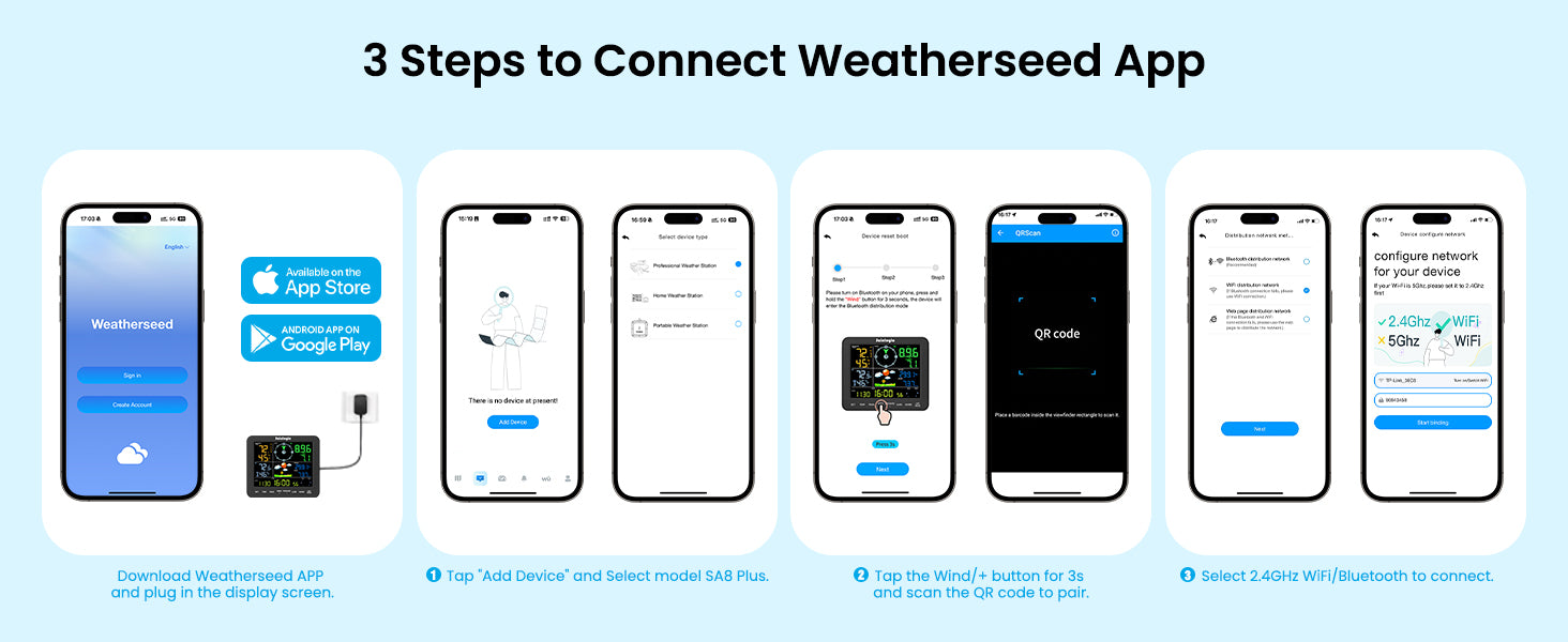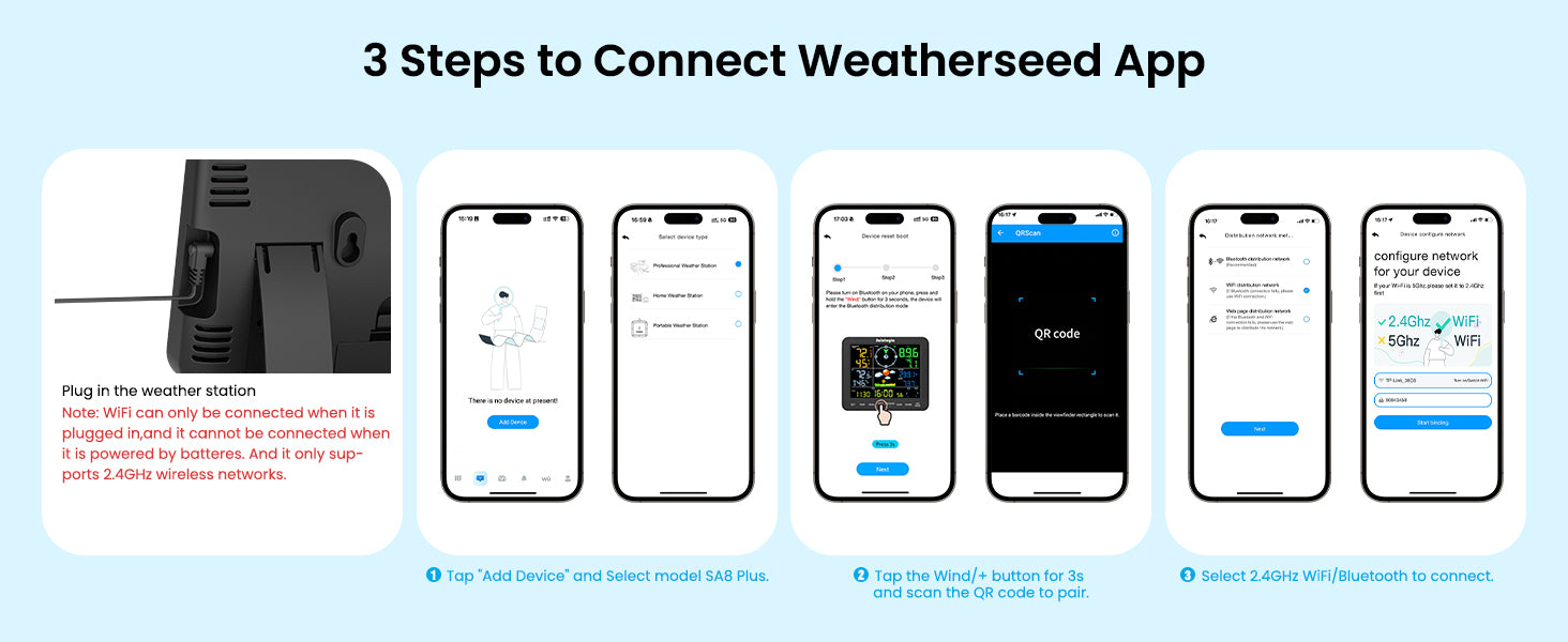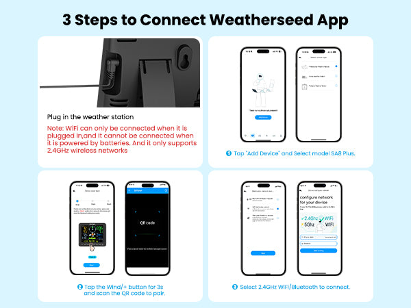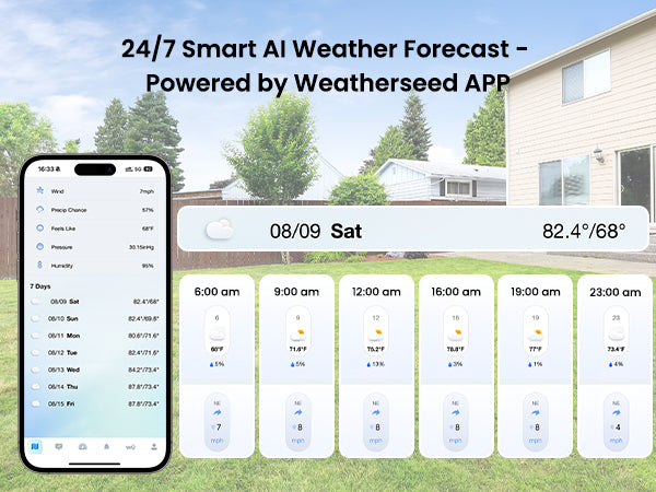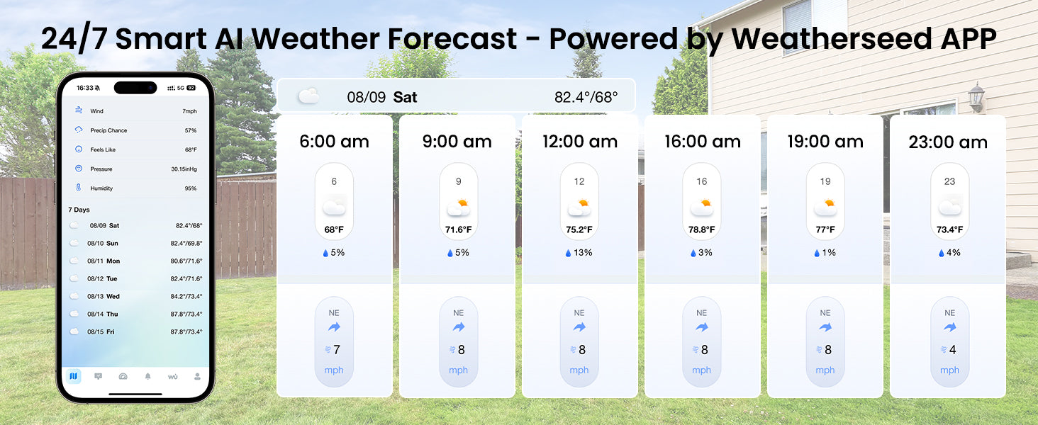 - WiFi + Weatherseed App + WU +24/7 Al Forecast & Alerts: Connect exclusively via 2.4GHz WiFi to the "Weatherseed" App, optionally integrating its built-in Weather Underground (WU) service. Delivering AI-powered 24/7 weather monitoring and ultra-precise forecasts. Receive instant alerts for critical changes in temperature, humidity, and barometric pressure directly on your smartphone, empowering decisions for home, garden, or outdoor activities.(Only 2.4G WiFi)