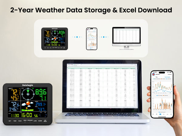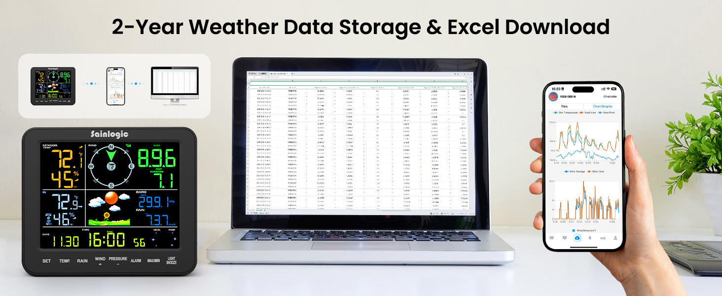 - 2-Year Data Storage & Dowload: Supports the storage of comprehensive weather data for up to 2 years and allows for downloading and exporting it to an Excel - format report. Track and analyze long term trends - temperature/humidity changes, frequency of severe weather, and seasonal patterns through intuitive charts. It is highly suitable for weather enthusiasts, farmers, and professional meteorologists.