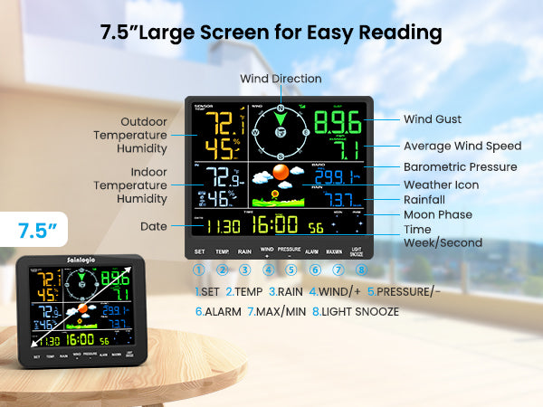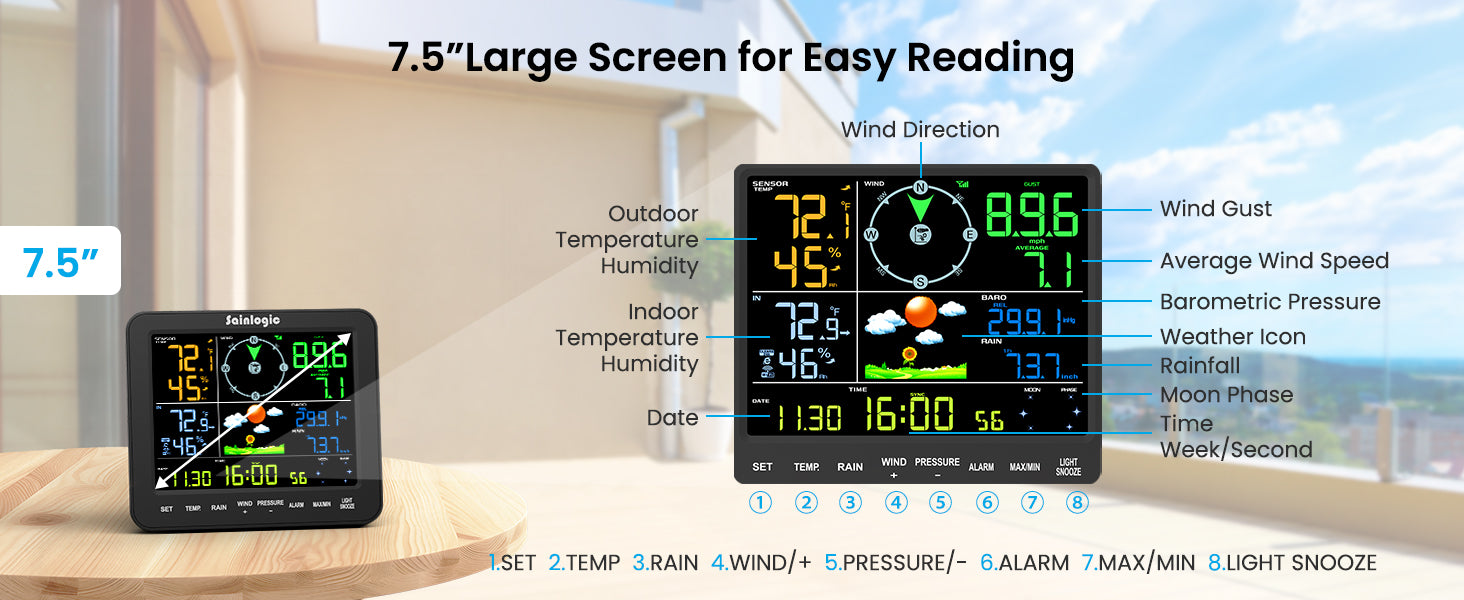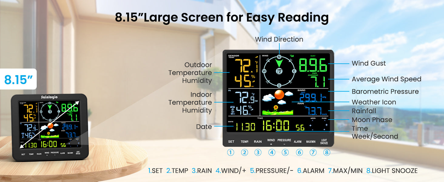 - 8.15” Clear & Easy to Read Display: Built for easy viewing, this weather station combines a high-contrast display with a user-friendly interface. Essential data such as temperature and humidity are displayed in specially enlarged, bold fonts for quick, clear reading. This is very suitable for middle-aged and elderly individuals with declining vision, helping them track the weather comfortably. It's also a thoughtful pick for gardeners and outdoor enthusiasts.
