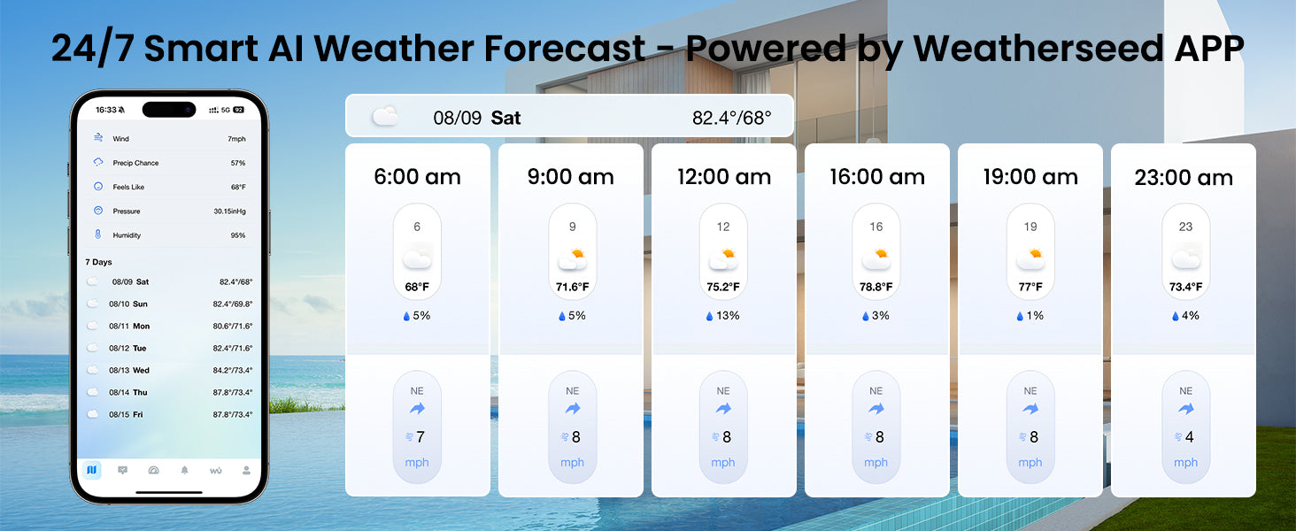 - WiFi + Bluetooth + WU Connected: The weather station connects effortlessly to the Weatherseed app in just 3 steps via WiFi or Bluetooth. Optionally integrate with Weather Underground (WU)service within the app. Enjoy free access to the Weatherseed app—no subscription fees! With a robust wireless range up to 330 feet/100m between the display console and outdoor sensor, it reliably monitors conditions across backyards, patios, lakefronts, and beyond