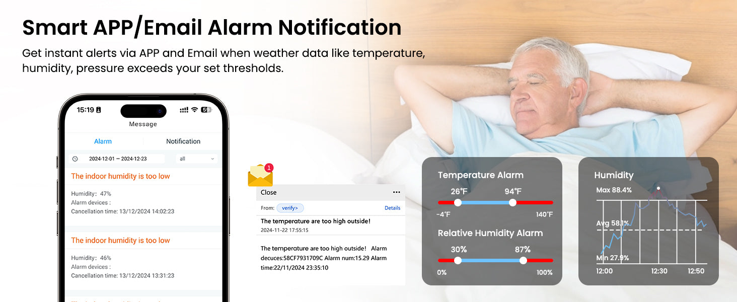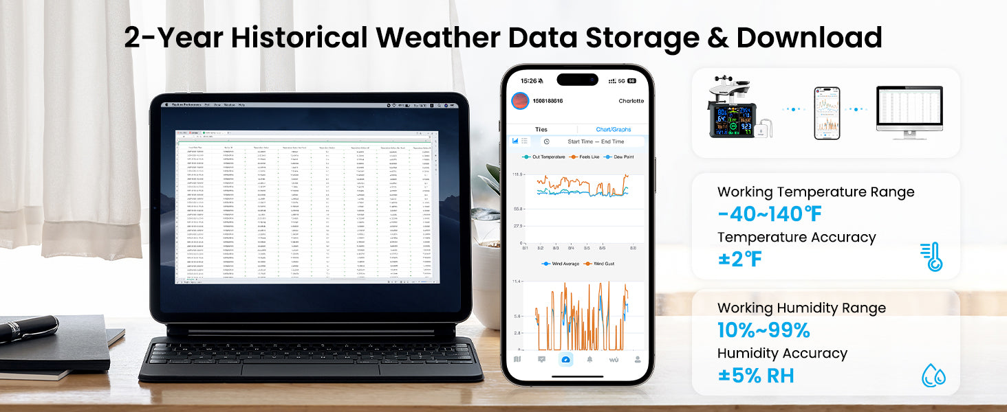 - Smart Al Weatherseed APP: Our weather station provides 24/7 AI-powered high-precision forecasts via the Weatherseed app. It delivers instant App/Email alerts when temperature or humidity changes reach your custom thresholds. The Weatherseed APP allows you to easily view 2-Year historical data and download/export the data in Excel format. It is very suitable for greenhouse cultivation, beach trips, and monitoring the environmental conditions in basements or RVs. It is an ideal choice for traveling families, gardening enthusiasts, and weather lovers