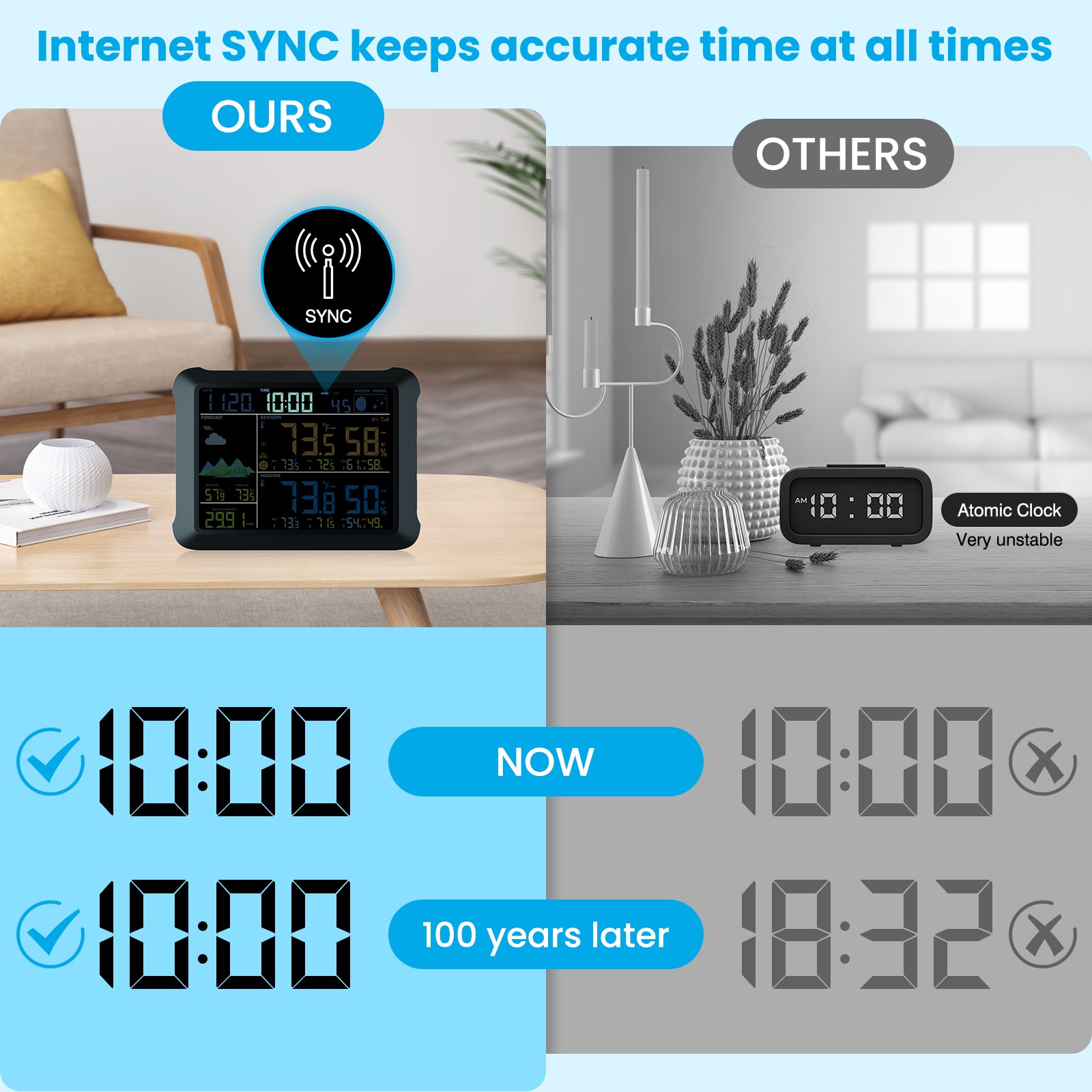 - Internet SYNCS: The weather station always keeps precise times and dates via WiFi, enhancing the accuracy of meteorological forecasts. Auto DST (on/off option) can avoid errors caused by manual adjustments and be easy to use. Compared with atomic clocks, WI-FI SYNCS is not restricted by the signal reception range and ensures that the time remains accurate throughout 100 years.