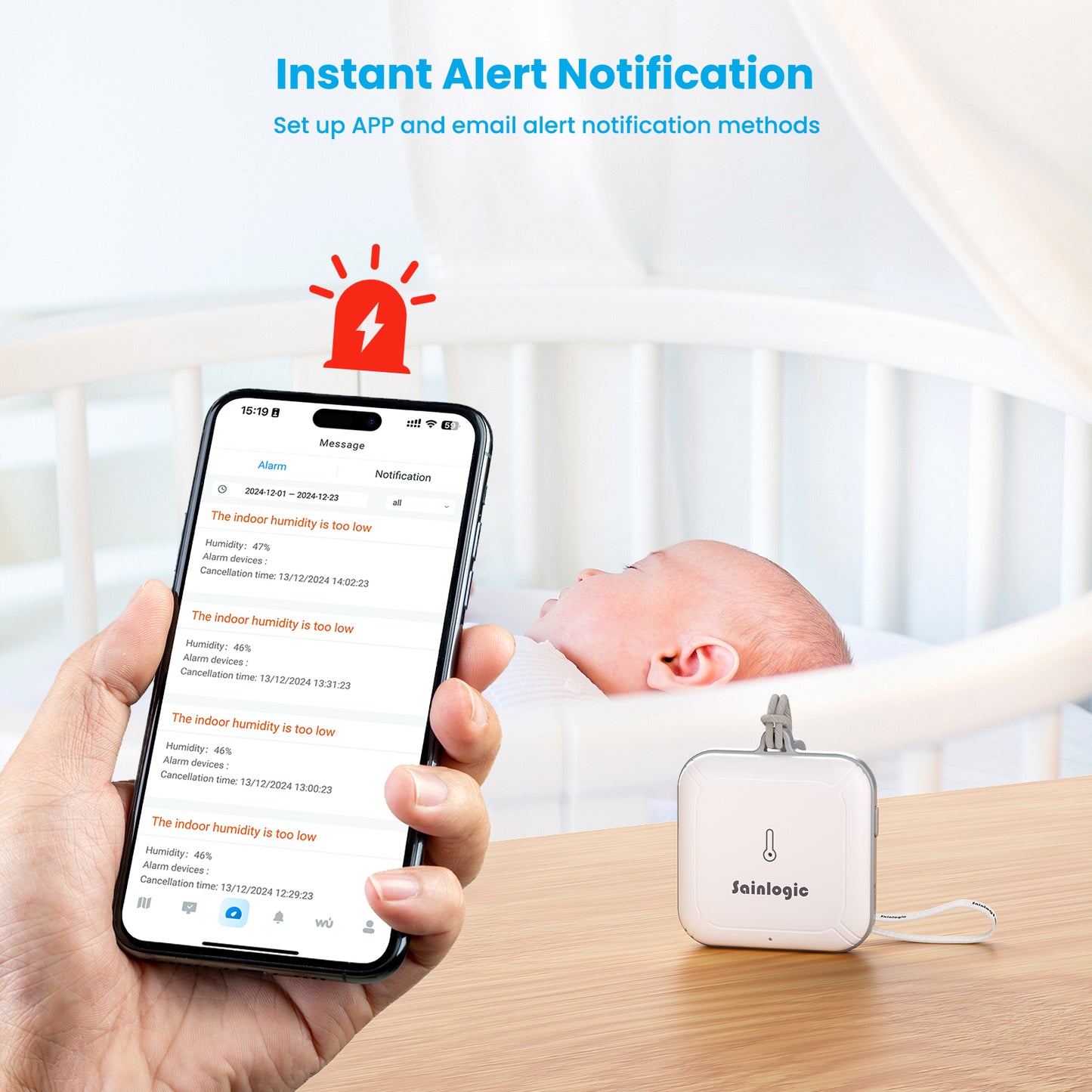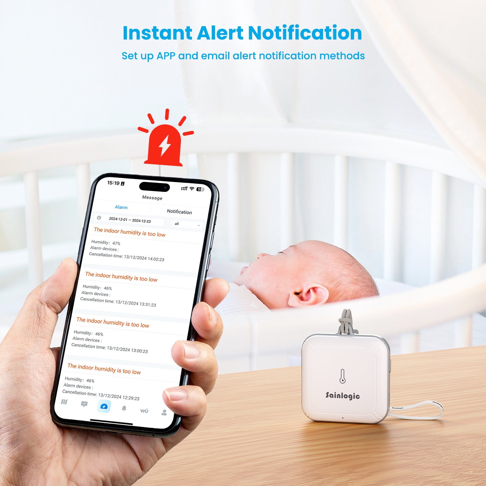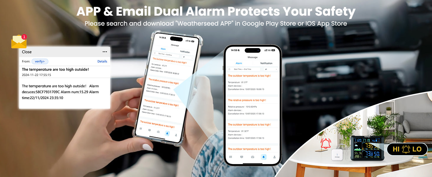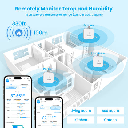 - 24/7 Instant Alarms: The weather station supports dual alarms via Email and App. You can set the alarm range and time to ensure timely receipt of alarm messages. If any preset value on the smart hygrometer thermometer is surpassed, our app can send a notification alert, enabling you to respond promptly to changes in your reptile tanks, incubators, greenhouses, basements, wine cellars, and more.