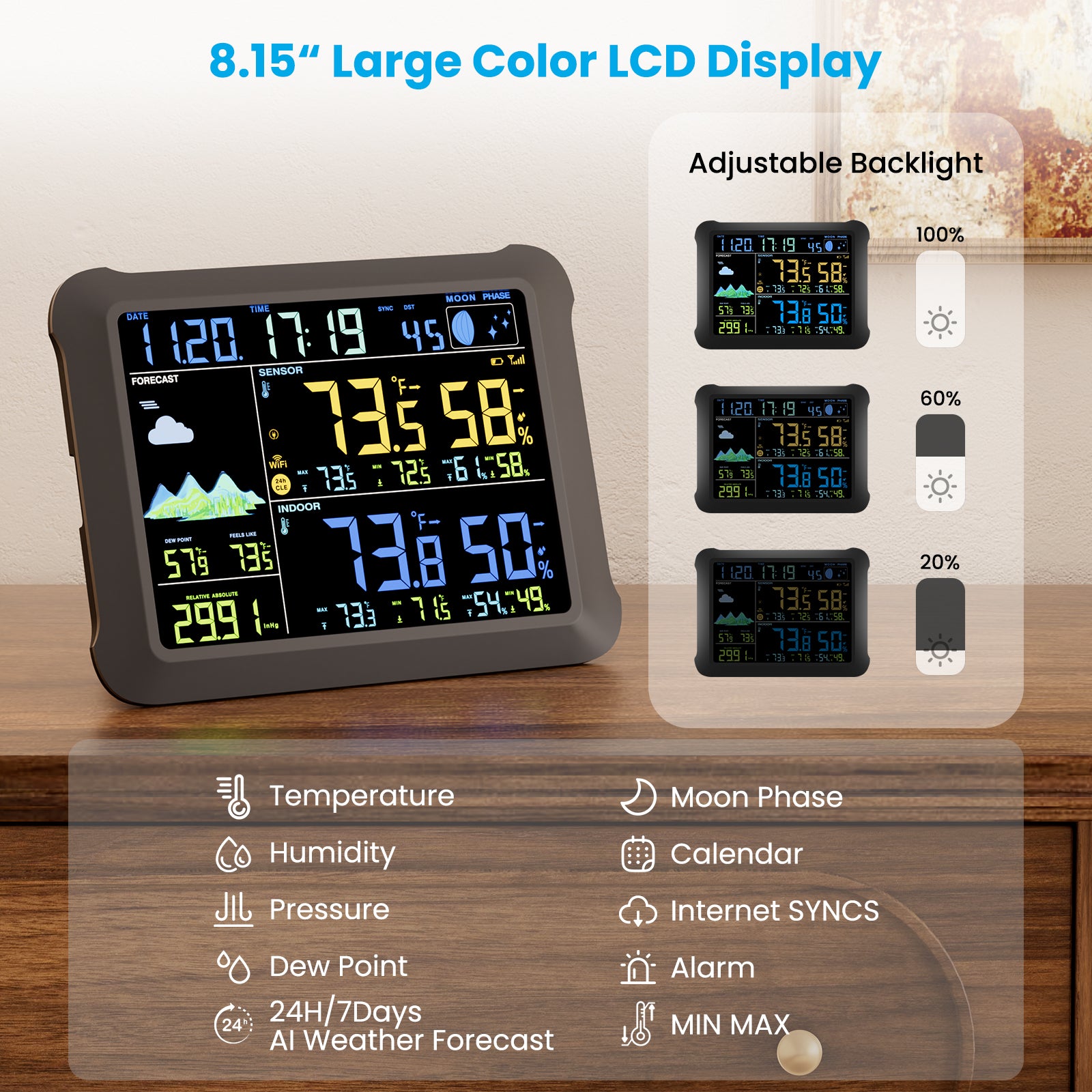 - 8.15-inch Color LCD Display: The large 8.15-inch HD color LCD screen is bigger than 99% of the brand's weather station. It allows you to see and read all relevant data from various angles. The humidity sensor transmits wirelessly and can be placed flexibly in places such as the living room, bedroom, balcony, garden, etc.