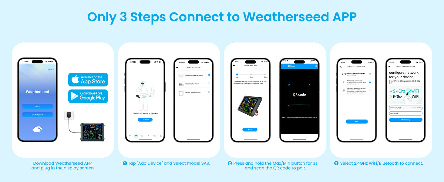 - Easy to Install & Setup: Installation is simple! Mount the outdoor sensor in minutes with the adjustable bracket, and sync it wirelessly to the display,make it beginner-friendly, even for non-tech users.You can connect to the Weatherseed app via Wi-Fi in just 3 simple steps.