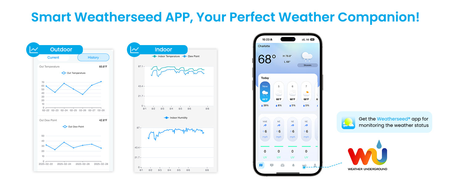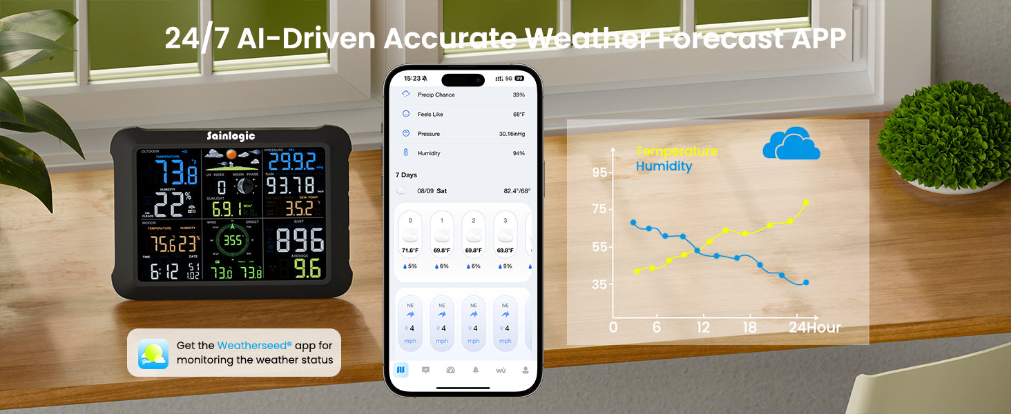 - WiFi +24H/7 Days Al Weather Forecast+Instant Alerts: Connect to the Weatherseed App via WiFi for 24h/7 days accurate weather forecasts, AI-driven predictions, real-time monitoring, and instant alerts via app or email for temperature, humidity, and barometric pressure.