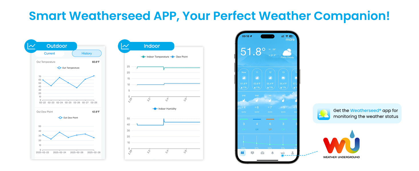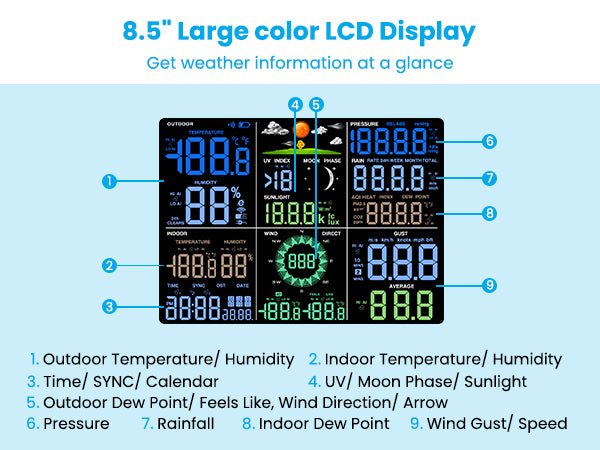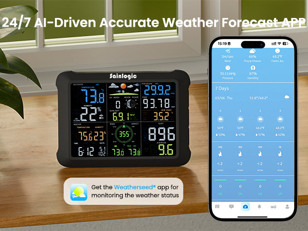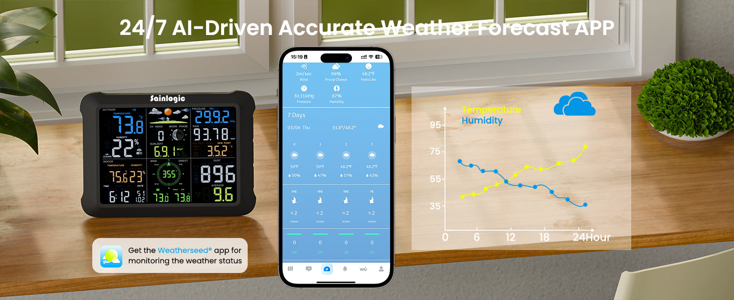 24H/ 7Days Accurate Weather Forecast by Weatherseed® AI, Wunderground, 8.5" Large Display, UV, Sun Light, Rain Gauge, Wind Gauge (Only 2.4G)