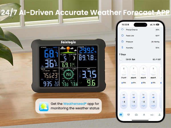24H/ 7Days Accurate Weather Forecast by Weatherseed® AI, Wunderground, 8.5" Large Display, UV, Sun Light, Rain Gauge, Wind Gauge (Only 2.4G)
