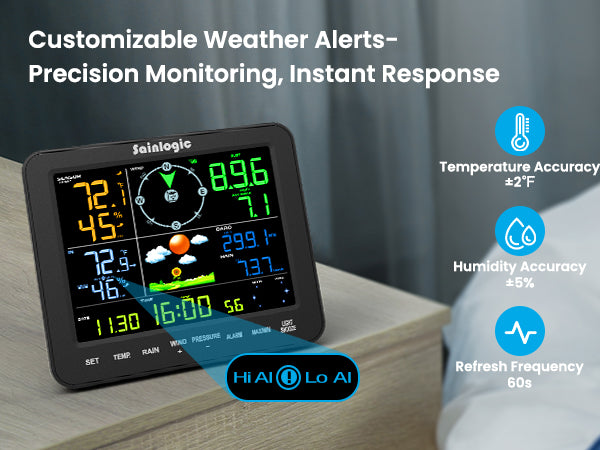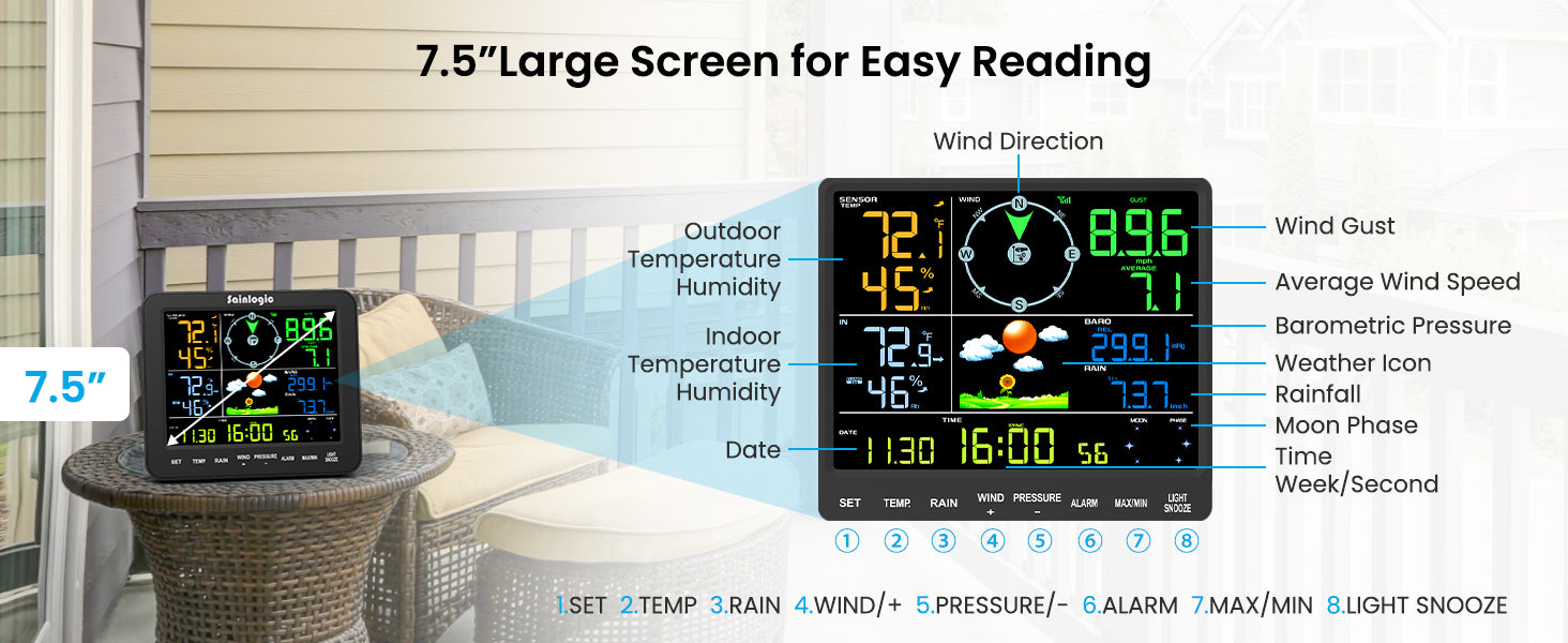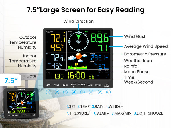 - Easy to Read Display with 3-Level Backlight: This weather station is equipped with an 8.15" high-contrast color screen and extra-large bold fonts, making the information clear at a glance. It also features manual 3-level backlight adjustment, ensuring clear display whether in the bedroom, kitchen, backyard, or garden. It is especially suitable for middle-aged and elderly users, providing a comfortable and low-fatigue visual experience and making it easier to obtain information.